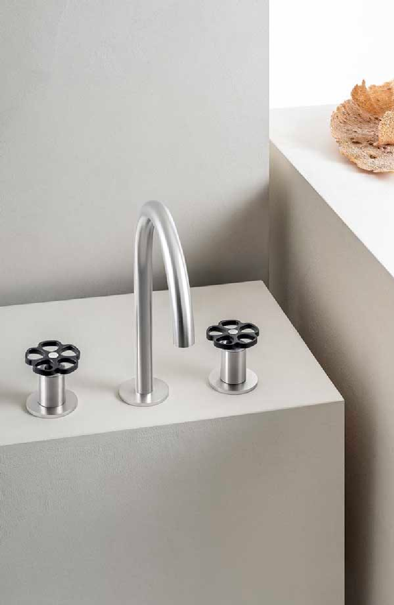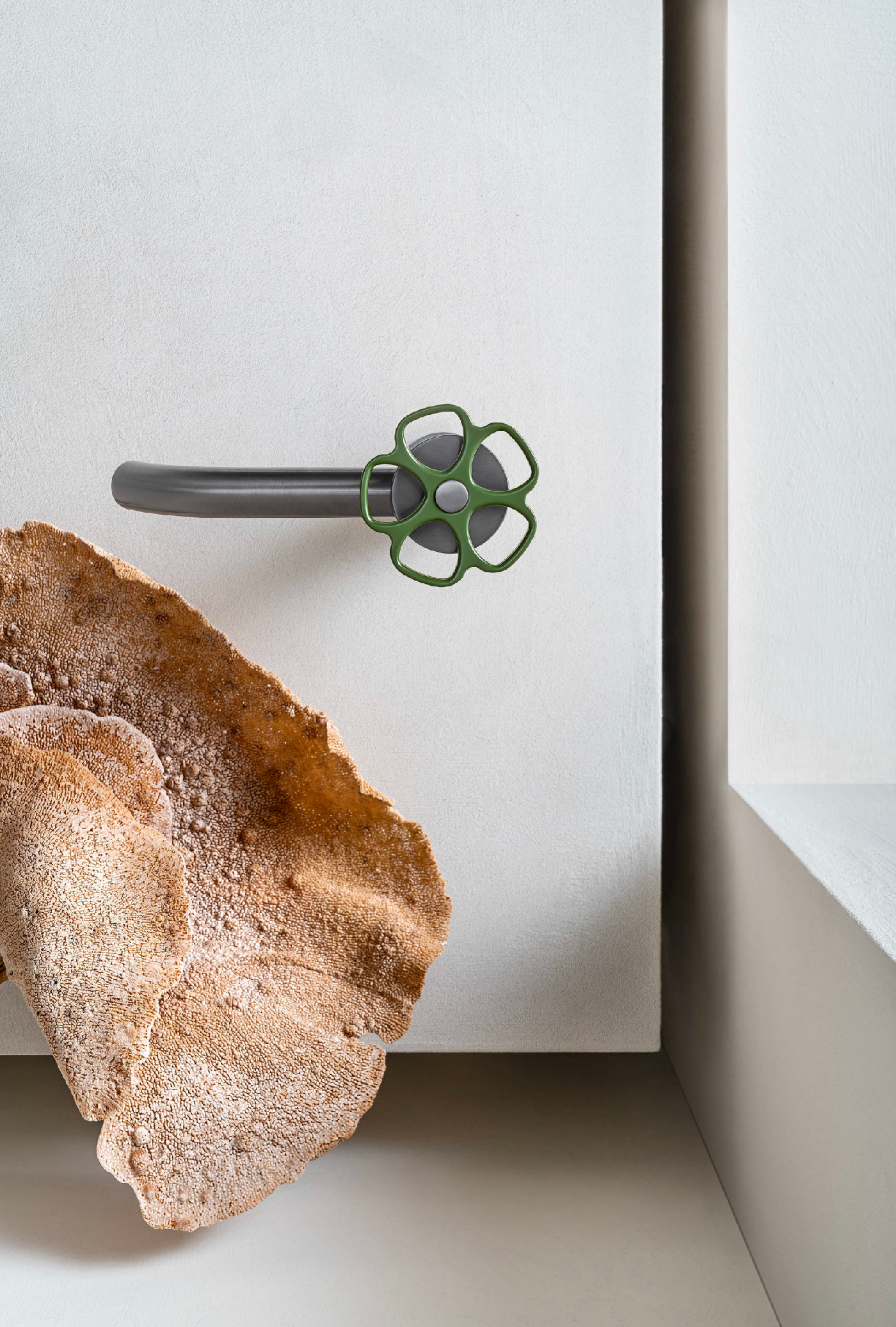 Flora porta un tocco floreale e vivace al bagno, reinterpretando il fiore in chiave industriale attraverso una maniglia unica che aggiunge una nota di leggerezza colorata all’ambiente quotidiano.