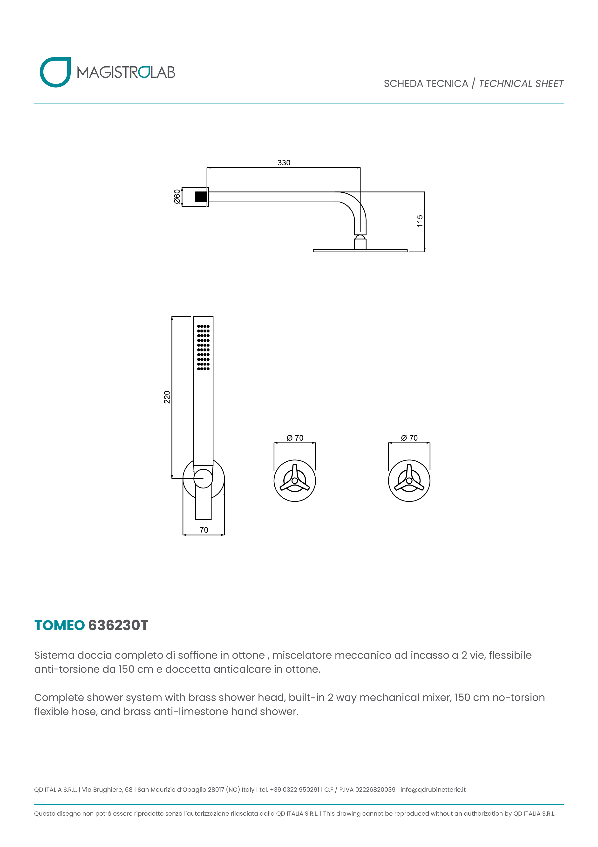 636230T Complete shower system with brass shower head with 35-cm arm, 2-way built-in mechanical mixer, brass antiscale hand shower and 150-cm anti-twist hose