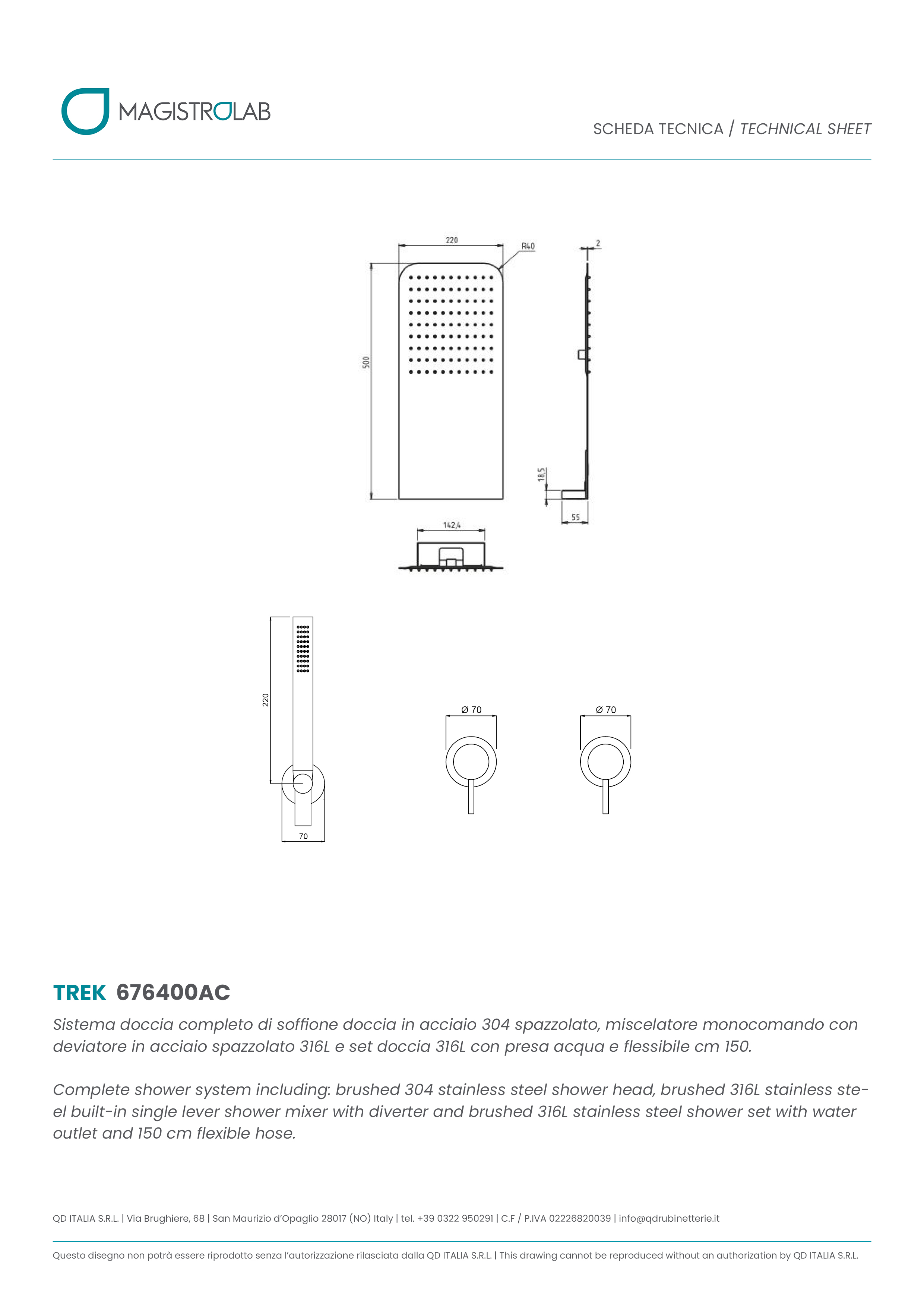 Complete shower system consisting of brushed 304 stainless steel overhead shower with rainfall jet (size 220×500 mm), single-lever mixer with brushed 316L stainless steel diverter, and coordinating 316L stainless steel shower set, including water connection and 150-cm hose.
