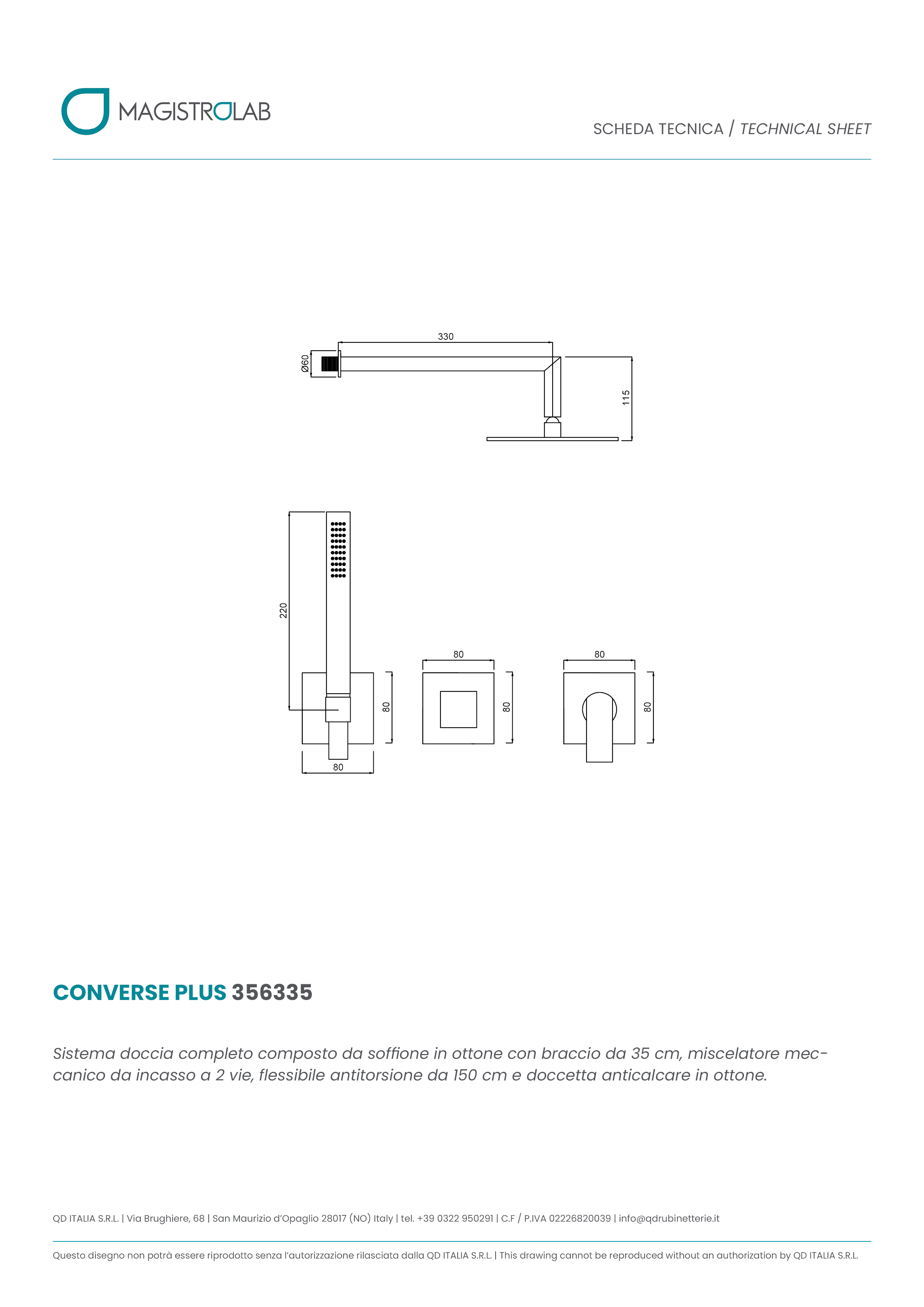 356335 Sistema doccia completo con soffione in ottone e braccio da 35 cm, miscelatore meccanico ad incasso a due vie, doccetta anticalcare in ottone e flessibile anti-torsione da 150 cm