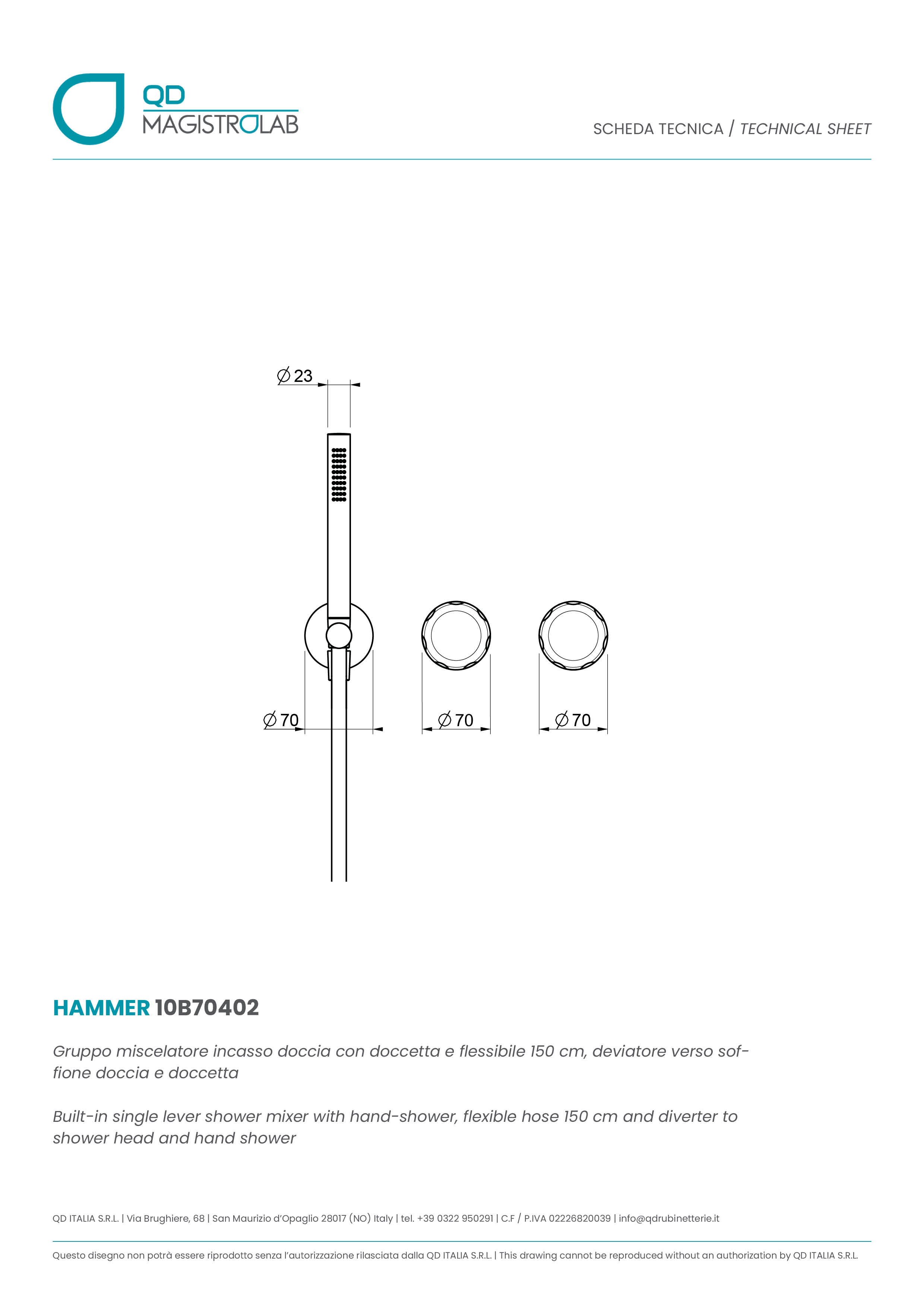 10B70402 Gruppo miscelatore incasso doccia con doccetta e flessibile 150 cm, deviatore verso soffione doccia e doccetta