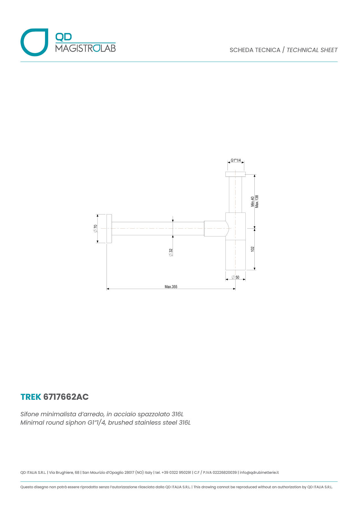 6717662AC Sifone minimalista d’arredo, in acciaio spazzolato 316L
